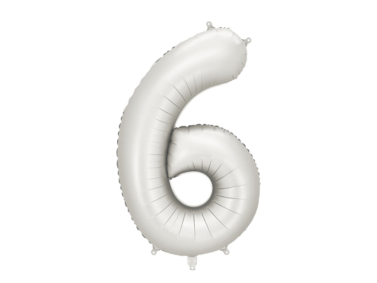 Satin foil Balloon Number 6 in silver, size before inflating approx. 100 cm (39''), size after inflating approx. 86 cm (34''). To be inflated with air or helium. The set includes a straw. The balloon is self-sealing. It has hooks for easy attachment to decorations.
