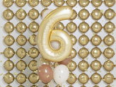 Ballon en aluminium satiné Chiffre 6 en doré, taille avant gonflage env. 100 cm (39''), taille après gonflage env. 86 cm (34''). À gonfler avec de l'air ou de l'hélium. Le kit comprend une paille. Le ballon est auto-scellant. Il dispose de crochets pour faciliter l'installation du ballon pour la décoration.