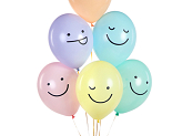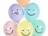 Ballons Strong Visages souriants, le set contient 6 modèles : pastel Menthe claire avec impression noire, pastel Lilas clair avec impression noire, pastel Rose pâle avec impression noire, pastel Pêche claire avec impression noire, pastel Jaune clair avec impression noire, Bleu clair pastel avec impression noire, diamètre approx. 30 cm.