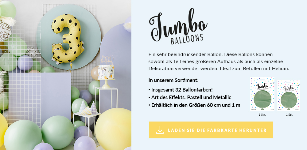 Unsere Riesenballons sind… riesig! Ihre Größe ist beeindruckend und zieht alle Blicke auf sich. Mit Helium gefüllt sind sie eine nicht zu übersehende Dekoration, die in Girlanden eine große Wirkung hat.