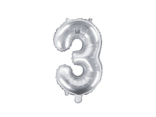 Metallisierter Folienballon, Ziffer ''3'' in Silber, Größe vor dem Aufblasen ca. 40 cm (16''), Größe nach dem Aufblasen ca. 35 cm (14''). Zum Aufblasen mit Luft.