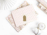 Rosa Geschenkpapier mit goldenen Metallic-Mustern (Blätter und Punkte), Breite ca. 70 cm, Länge ca. 200 cm.