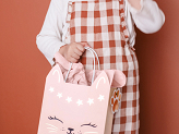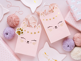 Rosa Geschenktaschen mit einer Katzenpfotenabdruck und einer Anhänger in Form einer Katzenpfote, Abmessungen ohne Griffe ca. 18 x 10,5 x 27,5 cm.