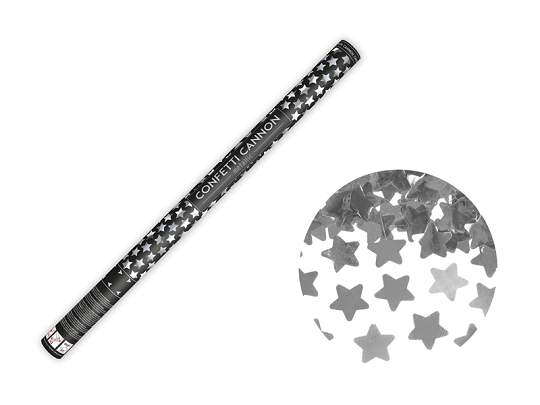 Die Konfettikanone schießt metallische Sterne in Silber, 80 Zentimeter lang.