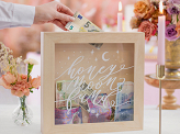 Drewniana skarbonka z białym napisem Honeymoon fund nadrukowanym na szybce z pleksi, wymiary ok. 6 x 30 x 30 cm.