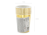 Paper cups in metallic gold colour with white inscription 60th Birthday!, hold up to approx. 220 ml (7.4 oz). Beverage cups bear the printed marking required by Commission Implementing Regulation (EU) 2020/2151 of 17 December 2020 laying down rules on harmonised marking specifications on single-use plastic products listed in Part D of the Annex to Directive (EU) 2019/904 of the European Parliament and of the Council on the reduction of the impact of certain plastic products on the environment. The product is labelled only in Polish, Spanish, Latvian, Estonian, Portuguese, Hungarian, Greek, Croatian and Romanian.