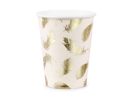 Cups Lovely Swan made of light pink paper with gold feather pattern, hold up to 260 ml (9 oz). Beverage cups bear the printed marking required by Commission Implementing Regulation (EU) 2020/2151 of 17 December 2020 laying down rules on harmonised marking specifications on single-use plastic products listed in Part D of the Annex to Directive (EU) 2019/904 of the European Parliament and of the Council on the reduction of the impact of certain plastic products on the environment. The product is labelled only in Polish, English, Maltese, Swedish, Finnish, Danish, Italian and Lithuanian.
