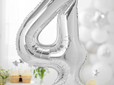 Metallic standing foil balloon Number ''4'' in silver colour, size before inflation approx. 90 cm (35''), size after inflation approx. 70 cm (27.5''). Inflate with air.