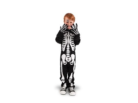 Children's Skeleton costume in black and white, size 116-128. Set includes costume and gloves. Composition: polyester - 100%. Care instructions: hand wash.