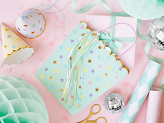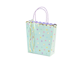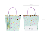 Gift bags in mint colour with colorful and gold metallic print, colorful ribbons and print in violet colour inside the bags, size without handles approx. 22 x 23 x 8 cm.