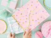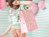 Gift bags in pink colour with colorful and gold metallic print, colorful ribbons and print in violet colour inside the bags, size without handles approx. 26 x 32 x 13 cm.