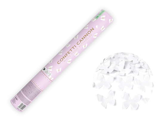 Confetti cannon shooting out paper butterflies in 2 shades of pink. The tube length is 20 centimeters. Works with compressed air, not a firework. Shooting range: 5-8 meters.