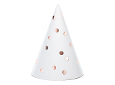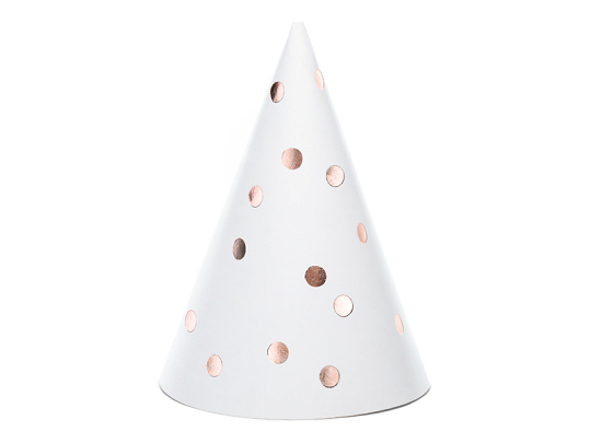 Chapeaux de fête en blanc avec motif de points en or rose, hauteur environ 16 cm, diamètre environ 10 cm.