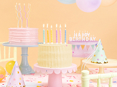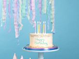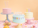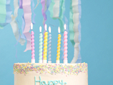 Bougies d'anniversaire Étoiles, couleurs pastels mélangées (jaune, rose, vert, bleu, orange, violet), hauteur environ 8.5 cm. Le set contient des bougies et des soucoupes.