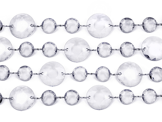 Kristallgirlande farblos, 1 Meter lang. Durchmesser der Kristallräder: kleine 18 Millimeter, große 30 Millimeter.