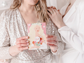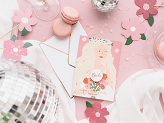 Carte de couleurs mélangées avec impression métallique dorée avec épingle avec inscription Bride et enveloppe blanche avec impression métallique dorée, taille de la carte environ 10,5 x 15 cm, taille du pin's environ 3,5 x 3,5 cm.