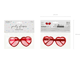 Okulary Serduszka w kolorze czerwonym, wymiary: szerokość oprawki 14 centymetrów, wysokość oprawki 6 centymetrów, długość zausznika 13 centymetrów.