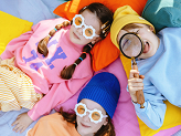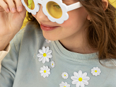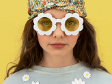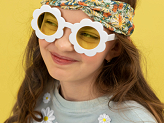 Gänseblümchen-Brille in Weiß mit gelben Gläsern, Maße: Rahmenbreite ca. 13 cm, Rahmenhöhe ca. 6 cm, Bügellänge ca. 13 cm.