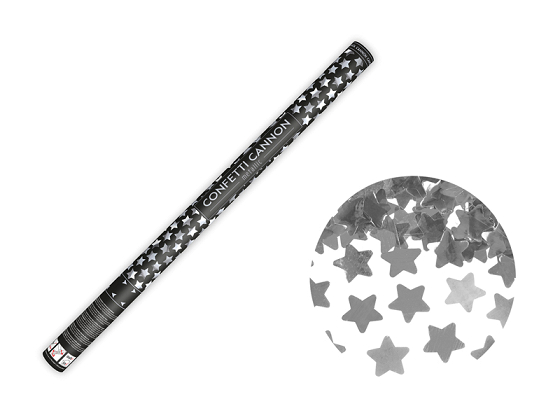 Confetti cannon shooting out metallic stars, silver, length 60 centimeters.