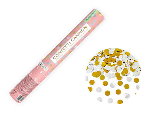 Confetti cannon shooting out metallic circles, double-sided - silver on one side and gold on the other, length 40 centimeters.